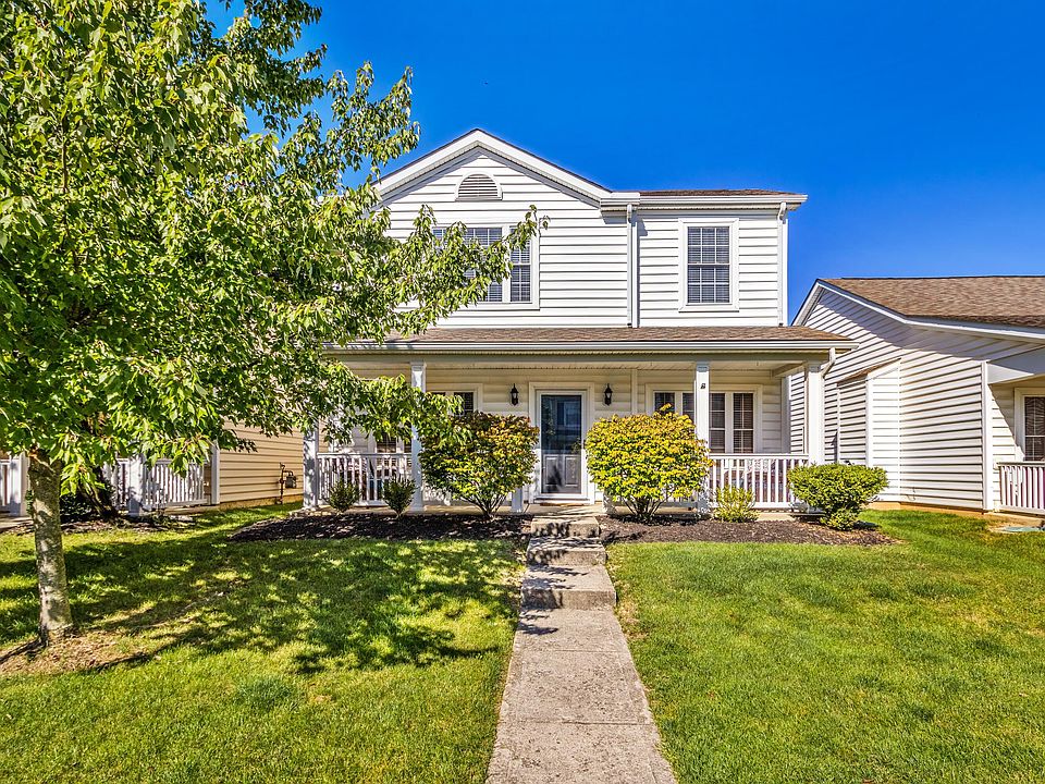 Move-in ready two story home! A large front porch welcomes you into a sun-filled living room featuring large windows and a gas fireplace. French doors open to a private first floor home office. Cabinet space in the kitchen is plentiful & pantry adds extra storage. Kitchen has newer granite counters & appliances, including a gas stove. A breakfast bar leads to the formal dining room. Laundry & half bath complete the first floor. Generous Primary Suite has tray ceiling, attached full bathroom & walk-in closet. Two additional bedrooms share a full bathroom. Attached 2 car garage. Enjoy low maintenance living, as the HOA provides lawn care and snow removal on the neighborhood streets! Other updates include new flooring on first floor, updated bathrooms throughout, & new light fixtures.
