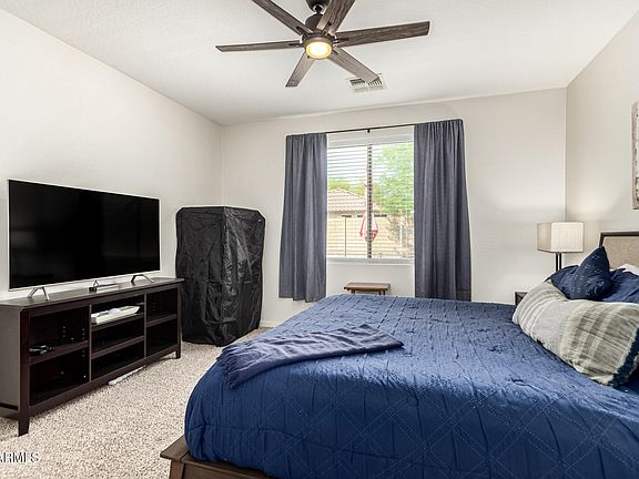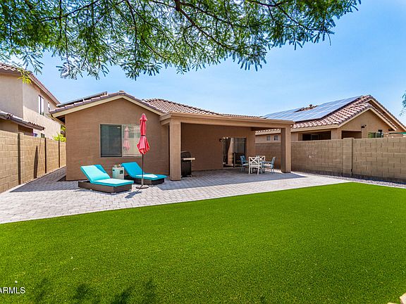 Welcome to easy living in the heart of Anthem! This well-maintained home offers style, comfort, and serious savings—with a transferable solar lease that's kept electric bills under $21/month since installation. From the charming front porch to the open-concept interior with soaring ceilings and fresh, modern finishes, it's designed for relaxed everyday living. The kitchen features quartz counters, stainless appliances, subway tile backsplash, and a breakfast bar ideal for casual meals or entertaining. Unwind in the spacious primary suite with dual sinks and a walk-in closet. Out back, enjoy low-maintenance artificial turf, a covered patio, and paver seating area—perfect for stargazing or weekend BBQs.