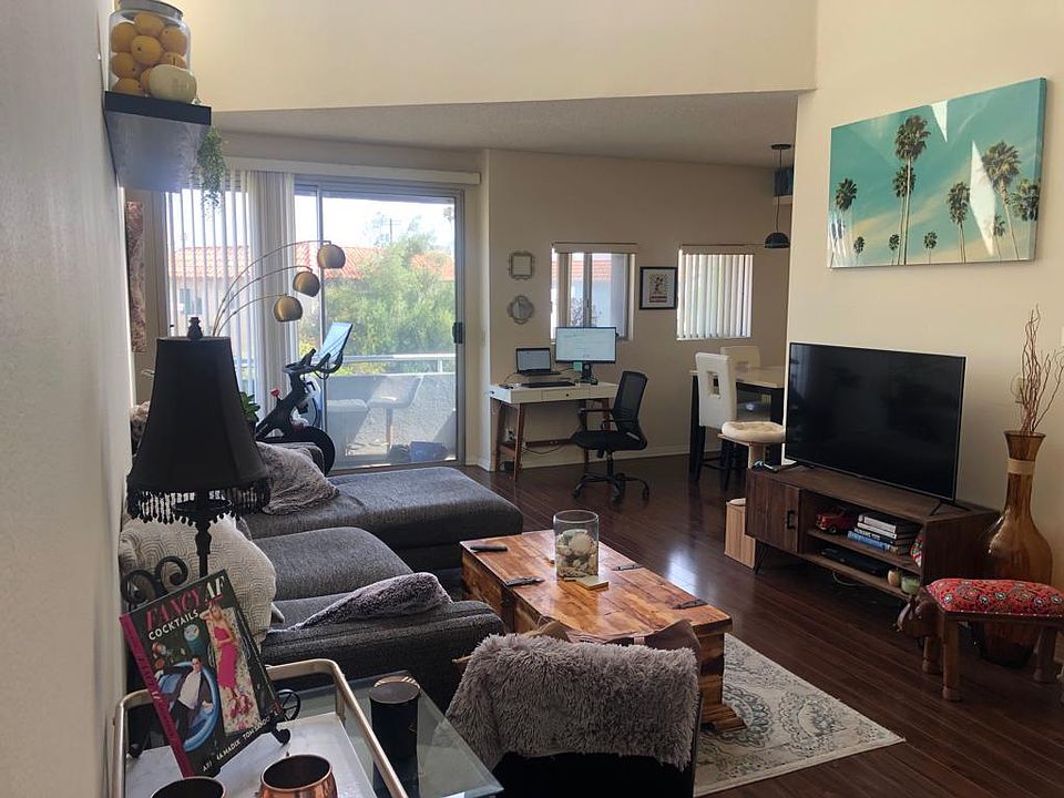 Spacious 2bed2bath with ample closet space, high ceilings, balcony and hard floors! Washer/dryer and dishwasher in unit. 1 assigned parking space in attached garage Great location in Culver West with great markets, coffee roasting, cafes, theaters and beach nearby! Owner pays for water. 1 assigned parking space. Kitchen is fully-equipped with microwave, fridge, stove/oven, dishwasher. Washer/dryer in unit. Balcony and fireplace. High ceilings.