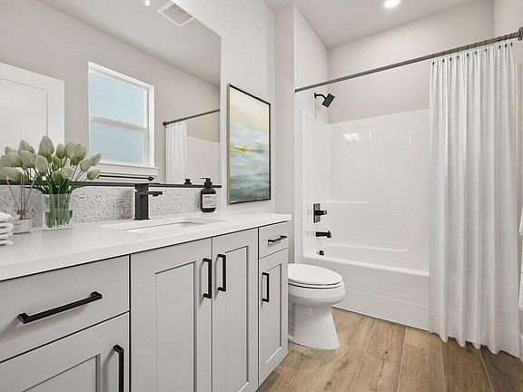 - Ceiling Fan(s), Double Vanity, Enclosed Toilet(s), Fiberglass Stall Shower, Kitchen Island, Linen Closet, Pantry, Primary Downstairs, Shower/Tub Combo, Smart Thermostat, Solid Surface Counters, Tile Shower, Vaulted Ceiling(s), Walk-In Closet(s), Wired for Data
