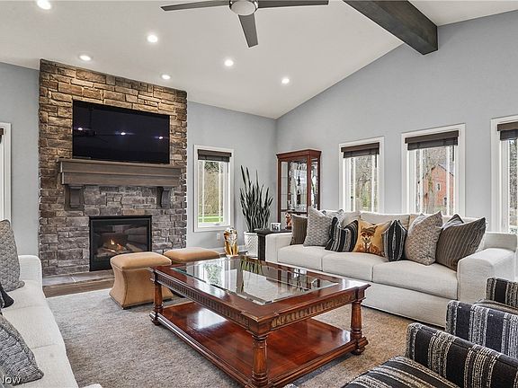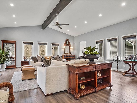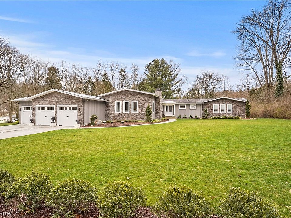 Outstanding ranch home and property nestled on 1.2 acres in Bath Twp. presents a very open floor plan for total first floor living. Engaging, vaulted great room with beamed ceiling boasts floor to ceiling stone gas fireplace hardwood floors. Fabulous, state of the art kitchen is the heart of the home and offers white cabinetry, massive center island/breakfast bar, SS appliances, skylights, under counter lighting, and spacious eating area. The bright and airy, family room features cathedral ceiling and French door leading to a covered porch overlooking the beautifully landscaped yard. Luxurious owners suite highlights vaulted ceiling w/beam, recessed lighting, 20' walk-in closet, and glamour bath w/walk-in shower. The third bedroom has been transformed into a luxury laundry room complete with built-in cabinetry, utility sink, and folding table. The lower level features a finished recreation room/multi-purpose room and ample storage. Notable amenities include high efficiency furnace & air, dimensional roof, upscale windows, 200 amp electric (2020), 3 car garage constructed with high ceilings and oversized doors, and premium Certainteed exterior siding and stone. Lifetime warranty on windows and exterior doors. Recent updates also include electrical upgrades in closets and basement, water softener, gutter heaters, attic insulation, custom window treatments; addition of a storage shed, driveway columns, electric driveway gate, vinyl fence, extensive landscaping. Quality construction throughout! Revere Schools.
