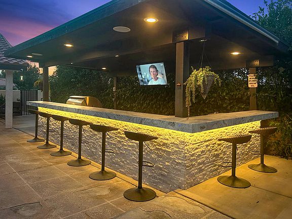 Welcome to your entertainer's paradise nestled in the desirable gated community of Regency Palms! Step into a spacious open floor plan featuring a chef-inspired kitchen, perfect for hosting memorable gatherings. Indulge in outdoor entertaining with a fully equipped outdoor kitchen & bar boasting seating for eight, complete with a professional grill, flat top griddle, drop-in cooler, and more!This smart home is designed for seamless entertainment year-round, with a large oversized pool and spa controlled by automated systems. Effortlessly set the mood with lighting controlled at the touch of a button or simply by asking ''Alexa''! Gather around the oversized fire pit on cooler evenings or catch your favorite sporting event at the bar or patio.Privacy is paramount with mature hedging and citrus trees providing fresh mixers for your favorite beverages. The envy of friends and family alike, this home offers both indoor and outdoor entertainment options. Three-car garage with smart openers, Swiss-Trax flooring, designer doors and EV charging station.For golf enthusiasts, memberships opportunities are available in the adjacent development, just a short golf cart ride away. Experience the ultimate in outdoor living and entertaining. HOA's include cable/Internet. Pool decking is scheduled to repaired and re-painted. Open Saturday May 18 12:00-3:00pm.