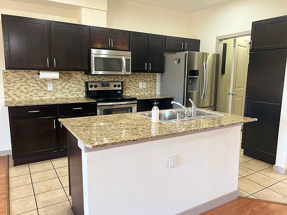 This modern 3-bedroom, 2.5-bathroom townhouse offers contemporary elegance and convenient living. The open floor plan seamlessly connects the living, and kitchen areas, creating a bright and spacious atmosphere. The kitchen features luxurious granite countertops, a stainless steel refrigerator, a large central island. The living room is enhanced by a sleek tiled fireplace, serving as a stunning focal point for cozy evenings. The media room provides an ideal retreat for movie nights or a home office setup. The primary suite boasts a spacious walk-in closet. The additional bedrooms are well-sized, offering flexibility for family. Located just minutes from the airport, this home offers easy access for travelers. With its stylish finishes and thoughtful design, this townhouse is the perfect blend of comfort and convenience.