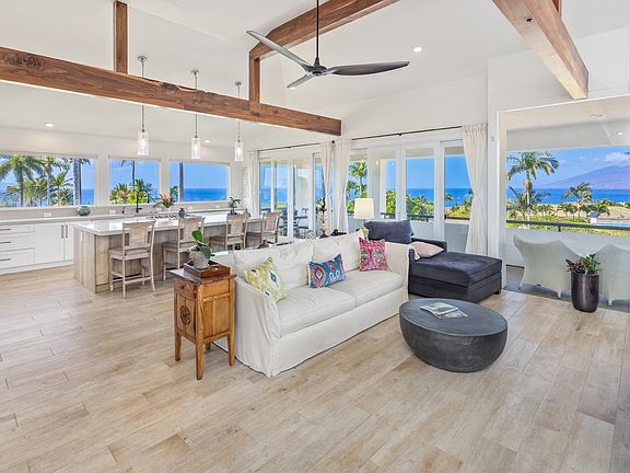 Presenting an extraordinary residence of rare refinement, anchored in the upscale residential community of Wailea Golf Estates. This elegant home reveals sweeping ocean panoramas and dramatic mountain backdrops, framed by open greenery and pristine fairways. The location offers a quiet, relaxed ambiance complemented by the upscale island lifestyle that Wailea is known for. Completely re-envisioned in 2022, the home now showcases a contemporary island aesthetic that radiates both warmth and an elevated style. The layout incorporates several inviting areas for relaxing and hosting, including two dedicated entertainment spaces: One inviting leisurely moments poolside, the other oriented to savor the soft colors of sunset from the beautifully refined kitchen and central living room. Lofty ceilings accentuated with rich Black Walnut beams lift the space upward, guiding your gaze toward the wide sweep of the Pacific. Floor-to-ceiling bi-fold doors fold away to unveil the outdoors, allowing the home to dissolve seamlessly into the landscape. Beyond the threshold, tropical foliage unfurls in layers of color and texture, surrounding a shimmering saltwater pool and spa that feels carved from a private island retreat. Outside, vibrant tropical landscaping, flourishing plants, and an exceptional saltwater pool and spa create a private resort-like escape. This premiere four-bedroom residence, with each suite offering its own private en suite bath, affords a level of comfort and discretion rarely found in Wailea. Its thoughtful configuration naturally supports multi-generational living, providing spacious, well-separated living spaces that allow owners and guests to come together with ease while still enjoying personal space. With whale season and the New Year right around the corner, the timing couldn’t be better: watch humpbacks put on a show and enjoy Maui’s best fireworks right from your own lanai. Set just minutes from Wailea’s pristine shores, championship fairways, designer shopping, and distinguished dining, this residence offers a way of living where sophistication, ease, and exclusivity converge.