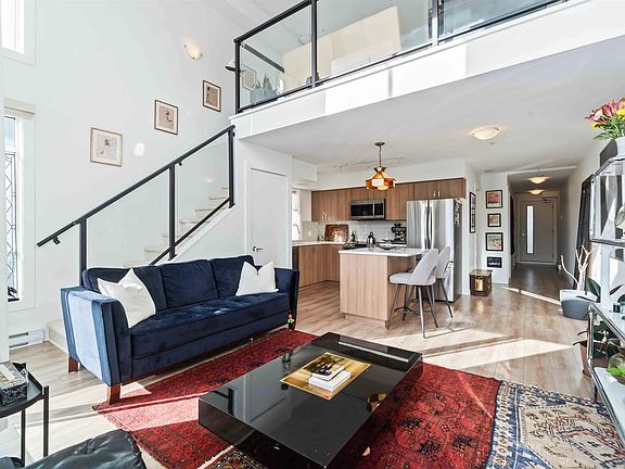 End unitBright open-concept living spaceVaulted ceilingsLarge loftScandinavian-inspired kitchenGenerous islandQuartz counters