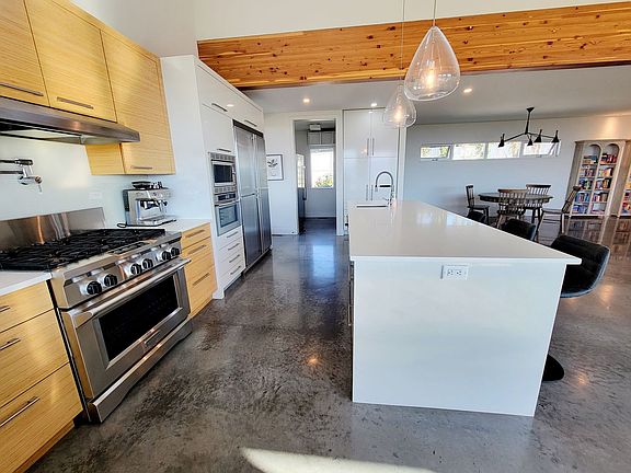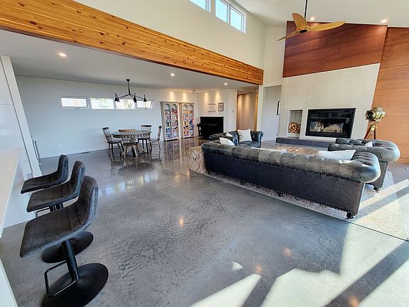 Inside, the residence features soaring ceilings, heated concrete floors, and a seamless open-concept design perfect for both relaxation and entertaining. The gourmet kitchen is a chef's dream, leading into a spacious great room anchored by a striking wood-burning fireplace. A private sunroom and versatile den provide flexible living spaces, while the dedicated office/media room on the top level captures 360-degree views.