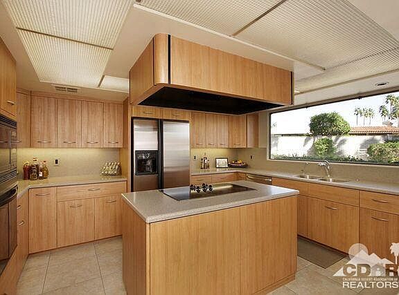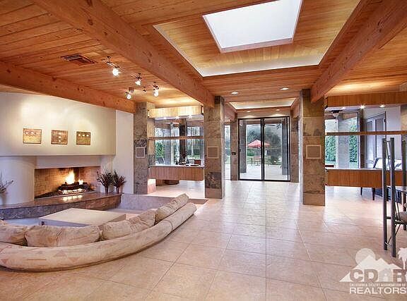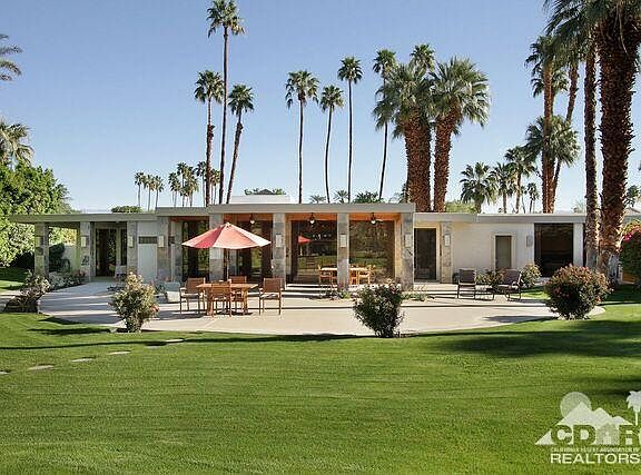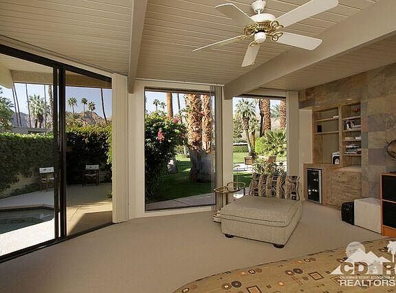 Thunderbird North is a much sought after and unique community of 10 homes surrounding a park-like greenbelt with pool in which homeowners share 1/10th ownership. A spectacular blending of indoor/outdoor living greet you as you enter this mid-century modern home. It is hard to take your eyes off the walls of glass with unobstructed views of mountains, greenbelt and palm trees...probably one of the most beautiful views in the desert! The open floor plan is high-lighted by the dramatic sunken fire-pit, travertine hearth, formal dining room, and wet bar that are perfect for entertaining. A cozy fireplace opens to the kitchen with stainless appliances, center island and breakfast bar. All 4 bedrooms have ensuite baths. The master suite also has a huge walk-in closet and private patio with spa. In addition you will find a large media room, powder room, large laundry room, 2-car garage, golf cart garage and tile thru-out all living areas. Adjacent lot APN # 688230021 Included in sale.