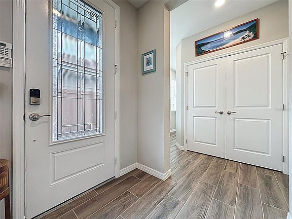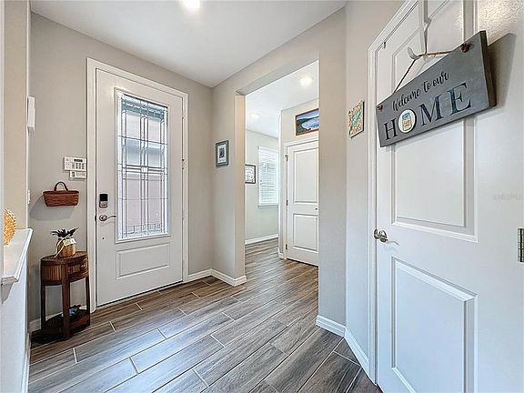 Nestled high on the hills in Trilogy’s GUARD-GATED active lifestyle community, this stunning home is loaded with upgrades. Inside, you’ll find Italian porcelain wood-look tile throughout, granite counters in kitchen & baths, open concept living, and a smart-home design. The spacious primary suite boasts dual sinks, walk-in shower, private commode, and custom built-in closet. Enjoy Florida living year-round with a huge extended screened and covered lanai, upgraded outdoor-rated ceiling fans, fenced yard with no rear neighbors, side paver patio, and dual Sunsetter electronic shades with wind sensors. Additional highlights include epoxy garage floors and overhead storage racks. Beyond your front door, Trilogy offers a lifestyle like no other. HOA dues include cable, internet, security monitoring, and lawn care. The 57,000-sf Magnolia House clubhouse is the social hub with indoor/outdoor heated pools, state-of-the-art fitness, dining, bar, live entertainment, sports courts, clubs, and endless opportunities to connect, play, and relax. Conveniently located 45 minutes to Theme Parks including Universal and Disney World and Orlando International Aitport, 1 ½ hour to Beaches and Port Canaveral Cruise Terminal. This isn’t just a home — it’s a lifestyle upgrade. Live your BEST LIFE at Trilogy! Also the new flyer that we are attaching.