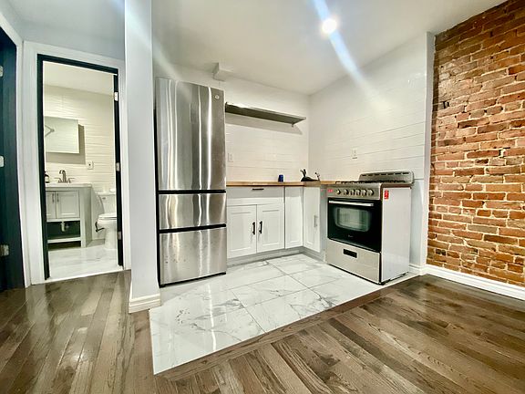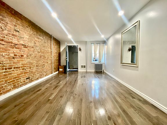 Welcome to this lovely brick townhome that features a HUGE living room with space for dinning and a desk, exposed brick, New floors, stainless steel appliances, a 4 burner gas range, a cutting board counter top, pure white back splash, new cabinets (additional kitchen shelving will be added), a stunning and chic renovated bathroom with tub, a Queen-sized bedroom with room for a dresser, recessed lighting and great natural light.