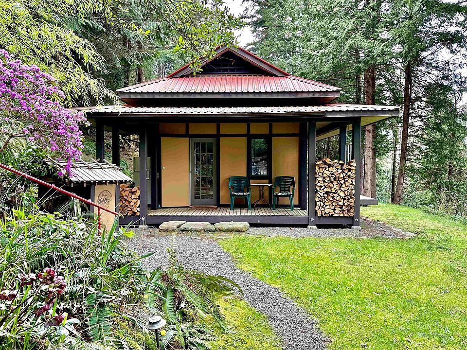 Welcome to your island retreat in the woods! Set on a private one-acre site within a 300-acre shared forested property, offering both personal space and access to extensive common land. This property features a beautifully crafted 650 sq. ft. main cabin and a 300 sq. ft. guest cabin, reminiscent of traditional Japanese architecture. Additional structures include an outdoor shower, garden shed, and wood shed, all nestled within well-maintained grounds compatible with the foraging deer. Unwind on the covered 425 sq. ft. deck and enjoy partial ocean views of the Georgia Strait while listening to the soothing waves and majestic eagle calls from a nearby perch. All essential services included – hydro, water, and septic. Just an eight-minute stroll to the beach!