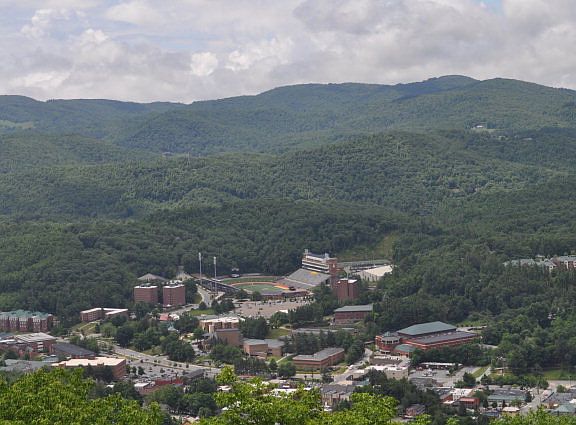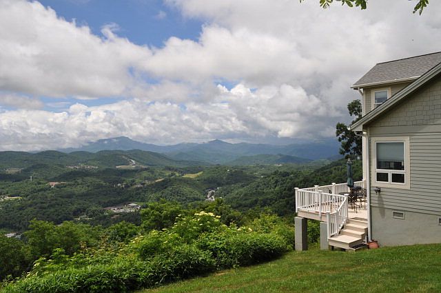 SPECTACULAR LONG RANGE VIEW: Grandfather, Boone, Appalachian State University (football stadium in direct sight line), Beech, Sugar & Appalachian Ski Mtns... Year around, easy, 5 min. drive to Boone. 1-level-living feasible from this 3BR/2.5BA home with flat front yard. True open living yet distinct spaces: great room, dining, kitchen & den flow for easy living & gracious entertaining - all offer MAJOR LONG RANGE VIEWS. Great room features soaring ceiling & massive, woodburning fireplace. Kitchen has eat-in bar, gas range, substantial granite counter space & sizable pantry. Den offers multiple usage options & enables folks to be eye-to-eye with clouds & mountains. Large master on main boasts soaking tub, shower & 2 individual vanities. 2nd floor has 2 additional bedrooms & full bath (1 is significant in size w/ numerous windows & tremendous views). Home has decks for all purposes: rocking chair front porch & 2 decks show casing the view - 1 open & 1 covered. Sizable laundry w/ utility sink & shower on main. 2 car-garage; lots of parking. One-of-a-kind offering. REDUCED!