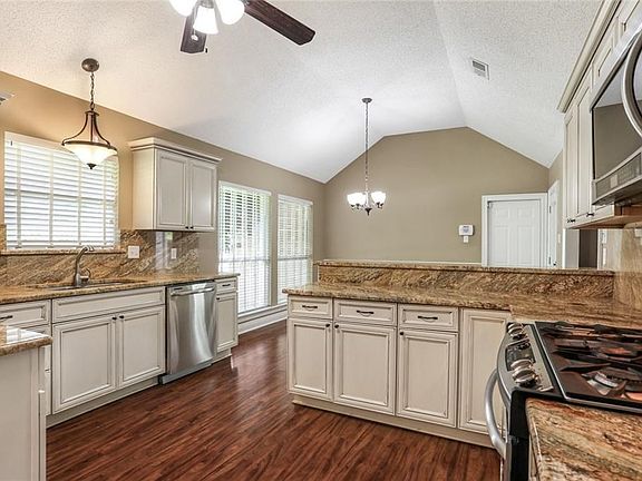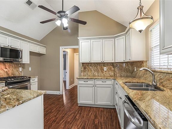 LOCATION, LOCATION! Lovely entrance with live oaks as you enter subdivision. Corner lot with side entrance to large backyard with privacy fence. Home features 4 bedrooms with split floor plan, granite, tray ceilings, formal dining as well as breakfast area, master that has jetted tub, separate shower and 2 large walk-in closets. Has covered patio that is 293 sq ft, which is not included in total sq ft. as different roof.