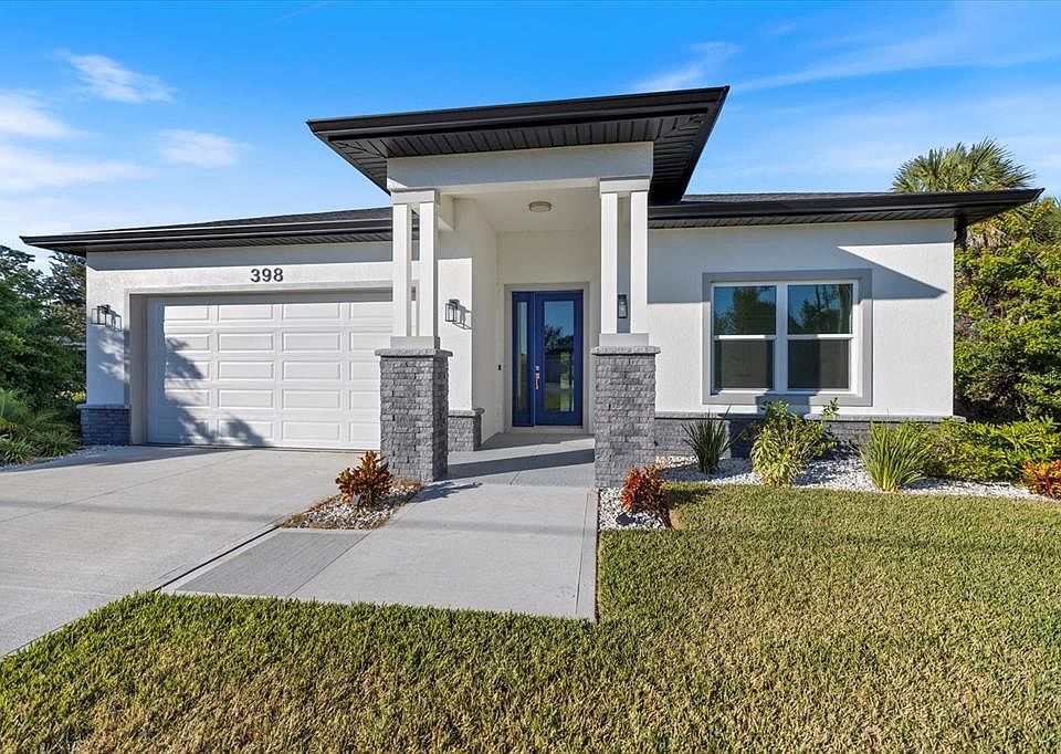 One or more photo(s) has been virtually staged. WHEN SIZE MATTERS! This FABULOUS FOUR BEDROOM will exceed your expectations! This beautifully designed 4-bedroom, 2.5-bathroom split layout home built in 2025 offers modern luxury finishes throughout. Located in a growing serene section of deed-restricted Rotonda Heights in a NO-FLOOD ZONE! With stunning curb appeal, this spacious 1923 sqft home greets you with a timeless stone veneer exterior front, full-view impact resistant glass door with sidelight, and stately pillars to create a grand entrance you’ll be proud of for years. Upon entry, soaring 10’ high cathedral ceilings welcome you home with a spacious entryway with elegant TRAY ceilings that sets the stage for this beautifully crafted home. Quality workmanship and thoughtful design elements include: Crafted wood window sills, 4 tray ceilings, elegant lighting, ALL IMPACT DOORS & WINDOWS, QUARTZ COUNTERS, larger square tile floors in every room, 6" tall baseboard, wood cabinetry, spacious walk-in closets with organizers, and modern tiled luxury bathrooms. WHOLE HOUSE GUTTERS, IRRIGATION SYSTEM are connected PUBLIC WATER & SEWER make this home move-in ready! The sparkling GOURMET KITCHEN flows seamlessly into the large living/dining area, creating the perfect open-concept for entertaining, featuring elegant lighting, Quartz countertop island bar, a convenient wine cooler, and sleek subway tile adorn the backsplash. A beautiful tray ceiling anchors the dining area, with impact sliders conveniently located for easy access for outdoor dining. The MASTER SUITE offers privacy in the back of home, featuring another beautiful TRAY CEILING, TWO WALK-IN CLOSETS, and a luxurious en-suite bathroom with dual quartz sinks, modern lighting, spacious walk-in glass shower and an upgraded private water closet. The backyard offers a covered lanai perfect for dining outdoors, and the lot is ready for a future pool. This PRIME Rotonda West / ROTONDA HEIGHTS location is near distinctive golf courses, marinas, and TWO BEAUTIFUL GULF BEACHES - Englewood Beach (17 min) or Boca Grande Beach (20 min), both offering nearby dining establishments! All schools within minutes away: Vineland Elementary (1-1/2 miles) L.A Ainger Middle (blocks away), and Lemon Bay (4 miles)! A 10-yr Structural Warranty included, plus a 1-year builder warranty gives you peace of mind for future years.