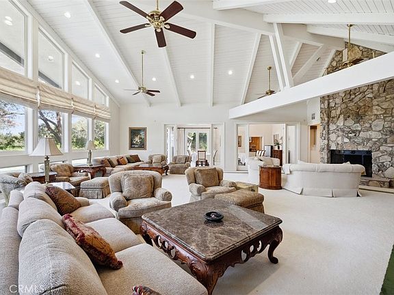 Designed for grand yet comfortable living, the 4,170± sq.ft. residence features soaring vaulted ceilings with exposed beams, walls of glass, and multiple fireplaces that create a warm, inviting atmosphere filled with natural light. The open-concept great room and family room flow seamlessly into spacious dining areas—ideal for entertaining. The galley kitchen with an adjoining breakfast nook provides ample workspace and could easily be reimagined into a chef’s dream kitchen.