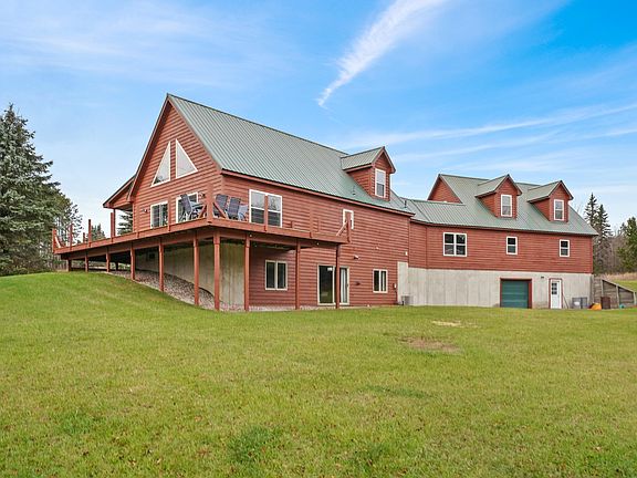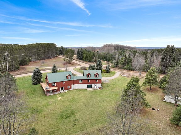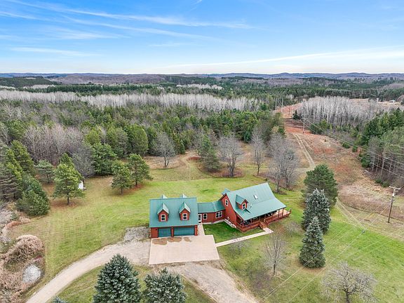 Nestled on 40 picturesque acres, this stunning two-story home offers breathtaking views of a lush forest landscape and expansive outdoor living spaces. Located just minutes from downtown Manton and Cadillac, this property provides the perfect blend of convenient access to town with the tranquility of the countryside. A spacious, wrap-around porch leads to a balcony that overlooks the property, setting a serene stage even before stepping inside.