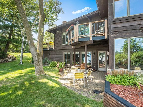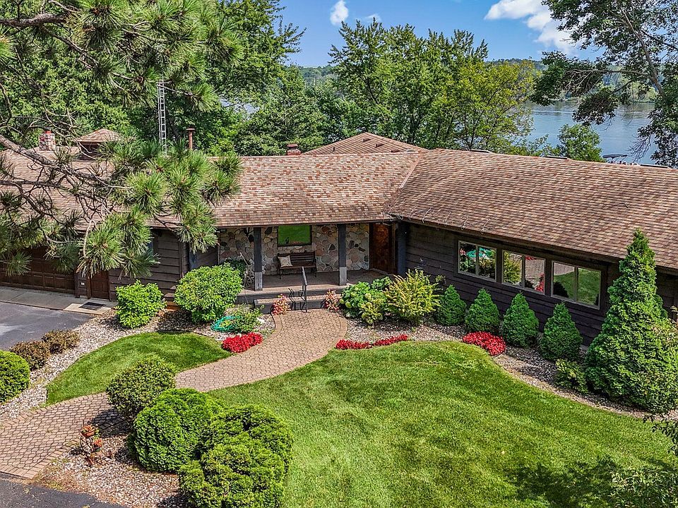 Offered for sale for the first time in over 40 years, this one-of-a-kind river property is remarkable and has unlimited potential. Postured on a 1.5-acre lot, the design focus was on encapsulating views from as many vantage points as possible. Angled room dynamics and multiple decks and patios highlight a river setting most people dream about. Travel to Via Riviera, a special place to live- best described as a lifestyle- to a tree-lined driveway that welcomes you an expansive rambler with a large yard and a welcoming front porch. As you enter through a custom wood door, you just know this home was crafted for those who appreciate unique design and defined spaces. A curved stairway greets you, and you will have immediate appreciation for a vaulted living space, ceiling beams, window-filled walls, a large fireplace, built-ins, and a corner bar. The kitchen has ample storage, tile backsplash, great counter space, and merges with an everyday dining spot that has floor-to-ceiling windows that have you enjoying the sunrise over the River. The formal dining room is accessible from the kitchen and offers yet another river view. A large, defined space that merges the garage and the living quarters serves as an oversized hobby space with additional cabinetry and work space, and an additional private office or main floor guest quarters. A second set of stairs led her to access lower level. The primary owner's suite occupies an entire wing of the home and has a beautiful space to take in the morning sun coming off the river. Appreciate a separate bath, shower, and walk-in closet. Plenty of garage space with 3 stalls attached, and additional 16x 24 work shop and a single stall detached garage. The lower level is incredible and has so much potential. A direct mirror of the upper great room, enjoy x. family room with room for living, recreation, and an easy walk out to the riverside. Enjoy a defined hot tub area, a full lower kitchen, incredible storage, and two guest suites- each with a semi-private bathroom arrangement. Don't miss the sauna- a great feature for the cooler days to come. Enjoy the professional photos and visit to start envisioning how you can call this one-of-a-kind estate yours.