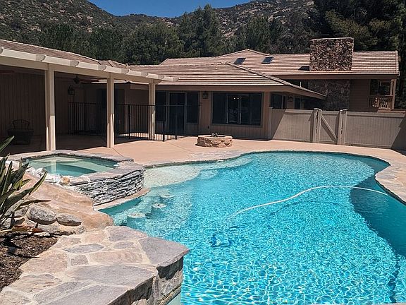 Welcome to the Luxury 5 Bedroom Home in Palo Verde Ranch, a spacious, high-end residence nestled in the mountains of Alpine, CA. The kitchen is a chef's dream, featuring granite countertops, a built-in SubZero fridge and freezer, double ovens, warming drawer, and an induction cooktop. Two of the bedrooms have en-suite bathrooms and two others have private fenced patios. The primary bedroom includes a fireplace and a separate home office/gym room as well as an en-suite that features a jetted soaking tub, walk in shower, separate vanities, walk-in closet and private water closet. The dedicated laundry room is equipped with a sink, lots of countertop space and ample custom cabinetry. The home's interior is accentuated by vaulted ceilings and skylights, creating a bright and airy atmosphere as well as vast custom mahogany built in cabinetry ensuring all your storage needs are met. A fireplace and custom wood ceilings provide warmth and ambiance, while the huge covered patio and entertaining space are perfect for hosting gatherings. The property is set on three landscaped acres, offering breathtaking mountain views and access to nature trails for those who love the outdoors. The home also includes two oversized, fully finished garages, RV/boat parking, and a service driveway. For relaxation, enjoy the heated saltwater pool, hot tub, or outdoor firepit. The property also includes a dog run for your furry friends and access to Palo Verde Ranch Lake which offers swimming, fishing, and a fitness center. Experience the luxury of solitude and the beauty of nature in this stunning home in Palo Verde Ranch.