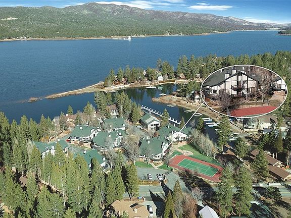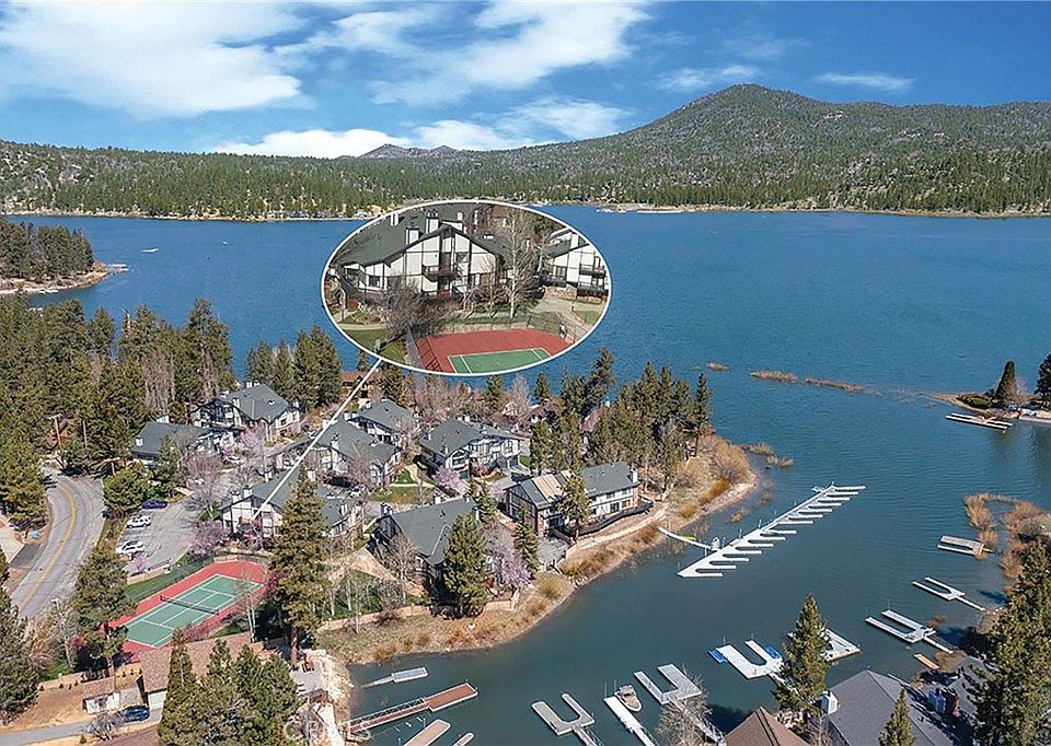 Viking Estates delivers resort-style living at its best featuring great amenities including a dock slip for owners (on a first request basis), lake access to the fun and adventure of the lake & a great clubhouse complex that can be enjoyed in all seasons offering an indoor pool, spa, lakeside sun deck, sauna and locker room, a well-equipped gym & a game room with pool table! Owners may also reserve the lakeside clubhouse for personal gatherings. This south-facing condominium delivers great natural light, updated wood-style flooring & a desirable location that overlooks the tennis-pickleball-basketball area. The open-concept kitchen, living & dining area offers a focal-point fireplace, breakfast bar & French doors opening to one of the homes two sunny decks providing the opportunity to enjoy the outdoors. Featuring 2 en-suite bedrooms + a convenient 1/2 bath, the primary suite boasts soaring vaulted ceilings, a natural gas fireplace, spacious closets, shower/tub, dual-sink vanity & its own deck. There is an in-unit laundry room with washer & dryer included, central heating & an attached single car garage! Offering a rare lakefront-adjacent location with the village shops & restaurants, ski slopes, hiking, mountain biking and many of Big Bear's most popular activities just minutes away! This intimate community is gated for added security. For extra ease, winter snow removal for the interior road & parking areas is handled by the HOA. This unit offers great options as a full-time home or a fantastic personal getaway with the added potential as an income-producing short term rental (STR)!