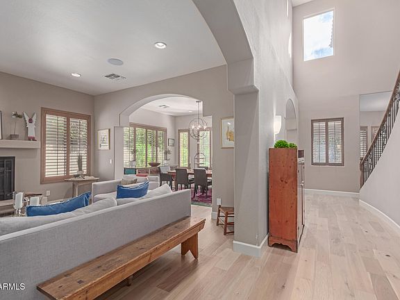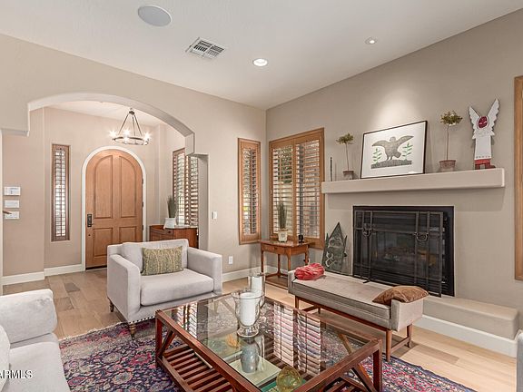 This well-designed home by luxury builder Toll Brothers is a must-see in the sought-after Aviano neighborhood. At 3,565 sq. ft., this home offers comfortable living with 5 bedrooms and 3.5 baths. Standout features include new wood floors, mountain views, new primary bath granite counters, new glass shower, new shower and bath tile, oversized soaking tub, and two large walk-in primary bedroom closets. High ceilings, tall doors and a built-in sound system throughout the home, garage and patio are just a few of the upgrades you will enjoy in this home. Other features include a large office/5th bedroom on the main level, plantation shutters, two fireplaces, large chef's kitchen with granite counters, GE Monogram appliances, island and a wine refrigerator. Abundant cabinetry and storage in the 3-car garage with epoxy garage flooring, new water heater, security system, reverse osmosis and water softener, two balconies upstairs, private back yard with tall trees and mature landscaping. The backyard has a built-in pergola with a fireplace, gourmet grill, and cooktop, perfect for backyard fun and outdoor entertaining. Enjoy resort style living in a very special neighborhood setting known for its luxury amenities, gorgeous landscaping, huge community resort-style pool, large gym, on-site exercise classes, planned events and activities, neighborhood holiday events, tennis, pickleball, and basketball courts, private parks, and playgrounds. You will love living in this special, friendly community designed for families and all ages alike! Top-rated schools, steps from prime shopping, restaurants, resorts, hiking trails, and your best Arizona lifestyle!