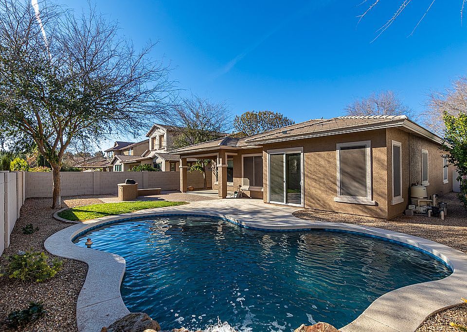 Prepare to be amazed! Come and see this wonderful 4 bed, 2 bath home In Lakeview trails at Morrison Ranch. Beautiful facade w/brick accents, lush grass landscape, and 2 car garage! Inside you will find an elegant foyer which flows into an open floor plan tile flooring, a fireplace, and designer palette throughout. The fabulous kitchen is comprised of staggered cabinetry w/crown moulding, a pantry, granite counters, tile backsplash, recessed lighting, SS appliances, and an island w/breakfast bar. Cozy den w/built-in bookshelves, perfect for a reading room! The primary bedroom features private outdoor access, a walk-in closet, & upscale ensuite w/dual sinks. The lovely backyard includes a covered patio, extended paver seating area w/built-in BBQ, and a refreshing pool! Schedule a Tour Today.