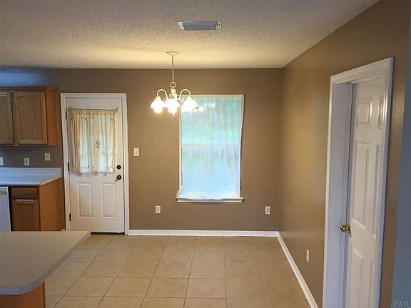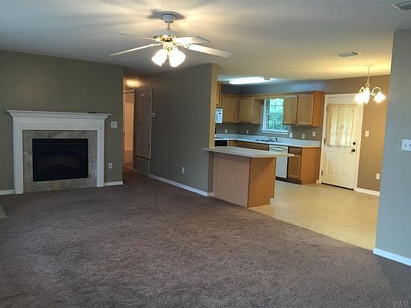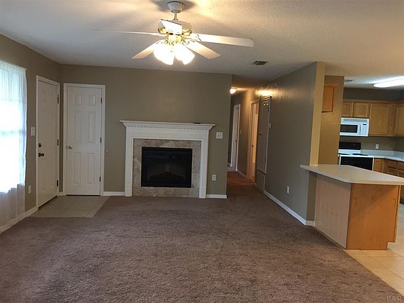 The Perfect Home for first time Buyers or downsizing in Pace. The open Living Area with electric fireplace sets the mood off right. The Kitchen with abundant Oak stained wood cabinets features breakfast bar, pantry, dishwasher, electric stove, built in microwave, tile floors and window over the sink for a view of the large back yard. The Master suite has a tub/shower combo with 18" tile floors and vanity cabinet. Two additional Bedrooms have ceiling fans, and carpet with an extra plush pad. Guest Bath has tub/shower combo and tile flooring. Inside Utility Room is spacious with room for extra storage, and boasts a new energy efficient hot water heater(10/14.) This functional home has an extra large partially fenced yard with mature oak trees, barrier vegetation and a dwarf blood orange tree. Gutters on front and back, replaced door hardware, and a fantastic location. This well maintained home is ready for you, so come take a look today.