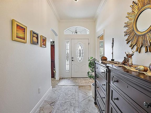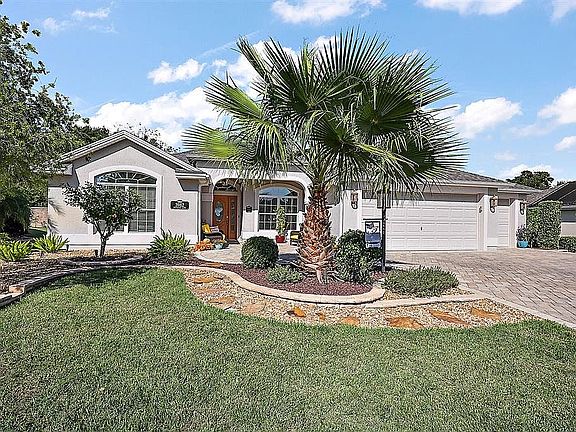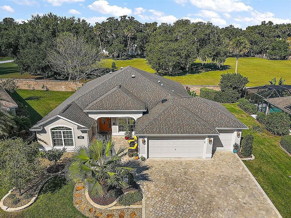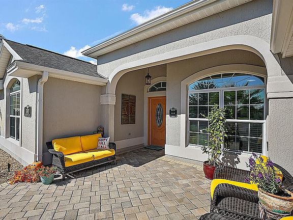 A stunning, STRETCHED Gardenia with rear privacy close to Brownwood, the upgrades are almost too numerous to mention. You'll love the cul-de-sac location as you drive up - the curb appeal is so fine, thanks to professional landscaping of palms and shrubs, and the installation of raised stone beds and pavers on the driveway and walkway, plus professional lighting that illuminates the home at night. As you enter, the foyer, you will immediately sense the elegance and spaciousness of the home. To the right, the kitchen will stun you - all of the appliances have been upgraded -- a Bosch induction cooktop is as good as it gets, plus double Bosch wall ovens (both convection capable and one also is the microwave), Bosch super-quiet dishwasher, and a Samsung top-of-the-line refrigerator with all of the bells and whistles including wi-fi capability. Abundant, custom cabinetry is finished in a warm cherry, and LED lighting above and below the wall cabinets really make them pop. The final touches are the upper-grade granite counters and gleaming diagonal tile floors. Such room for guests! The counter seats as many as four, PLUS there is a seating area (now a cookbook display / study) for a table and chairs for 4-6 additional guests. Returning to the foyer and entering the living room, you'll see why the Gardenia floor plan is the runaway favorite of the Designer homes in The Villages - a super-flexible living and dining room space adjoins the kitchen so that you can entertain your guests, and the STRETCHED lanai beyond is FOUR FEET deeper and TWO FEET WIDER than standard, and has been enclosed with a "mini split" HVAC for year-round use. Custom millwork throughout this home includes 5.25"" baseboard, CROWN MOLDING and custom window cornices, and the mood in the home is made particularly cheerful by the addition of four solar tubes. The master bedroom is tucked away to the right of the home and features the ROMAN SHOWER, commode privacy, dual sinks and dual walk-in closets. The guest rooms are diagonally across from the master, in the front of the home to the left as you enter, and have been STRETCHED (there's that word again!) two feet, yielding exceptional space.