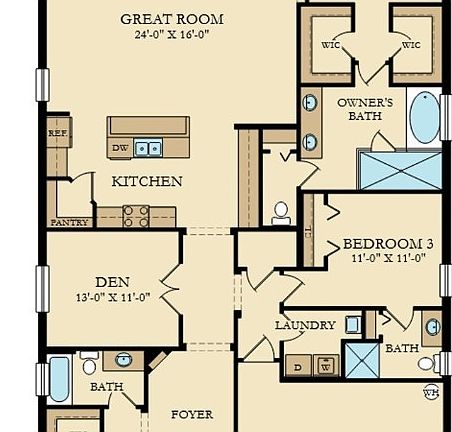 The primary suite includes a walk-in closet and an en-suite bath with dual sinks and a glass-enclosed shower. Two additional bedrooms provide flexibility for guests or family needs, while a bonus den offers the perfect space for a home office, craft room, or fitness area.