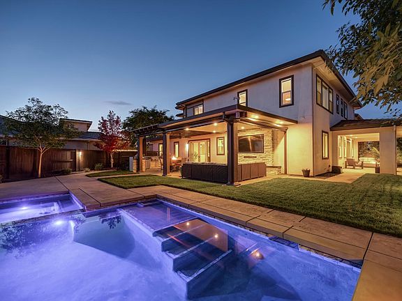 Better than new! This beautifully upgraded home with OWNED SOLAR sits on a large lot and boasts a highly functional floor plan, including a downstairs bedroom with an attached full bath-perfect for guests or multigenerational living. More than $500K in upgrades elevate this property far beyond new construction. The chef's kitchen features a Butler's pantry, custom cabinetry with glass inserts, a dramatic six-waterfall quartz island, full under-cabinet pre-wire, and premium Thermador appliances including a 48'' six burner gas cooktop. Main level living shines with 2'x4' high-gloss porcelain flooring, solid 8' doors, designer two-tone paint, and remote automatic blinds. Upstairs offers 3 bedrooms including a large master suite with walk-in closet and a large converted theater room. Additional features include whole-house audio, French doors in the dining room, epoxy garage flooring, and an upgraded glass garage door. Step outside to a resort-style oasis with a custom outdoor kitchen, entertainment wall with TV, expansive patio cover, stamped concrete, full landscaping and lighting, and a spectacular pool and large spa. Just a 25 min drive to downtown, close to parks, walking trails, a short drive to Folsom Lake, Palladio at Folsom, and El Dorado Hills Town Center shopping.