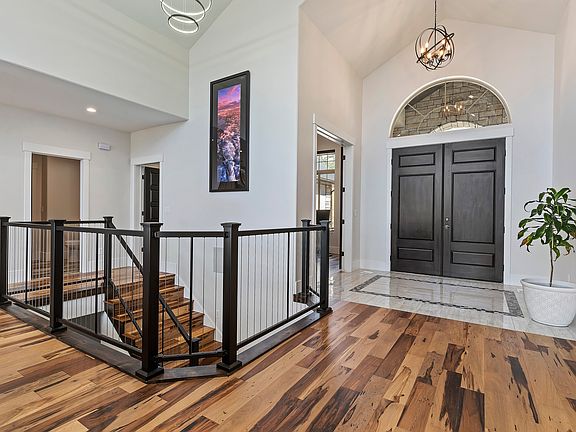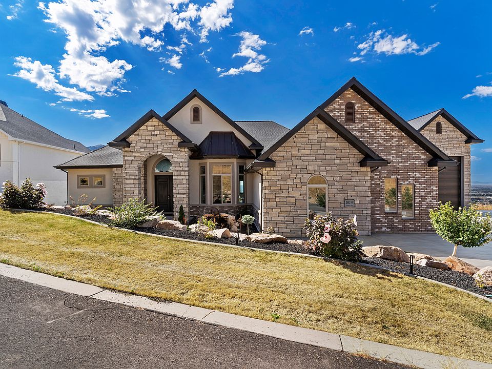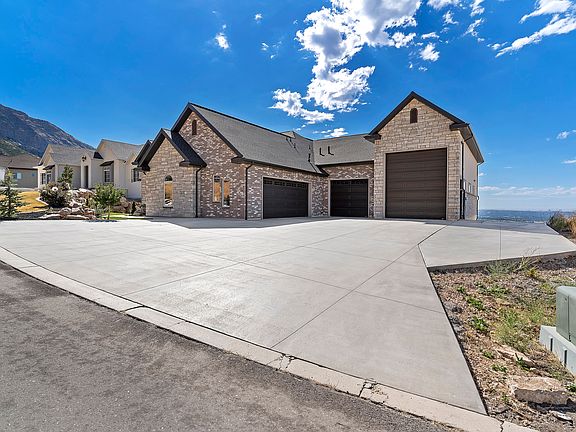 Experience unparalleled luxury in this immaculate, custom-built mountainside retreat, poised high above North Ogden with breathtaking, never-ending valley views. This bright, open floor plan features soaring vaulted ceilings and an expansive great room anchored by a gas fireplace. The chef's kitchen is a masterpiece, boasting custom cabinetry, granite countertops, and a commercial-grade Thor range/oven and hood vent. The opulent primary suite offers private deck access, a massive ensuite with heated floors, a dual-head shower, and a custom walk-in closet. Enjoy smart living with motorized shades, a whole-house speaker system, and dual-level laundry. The fully finished walkout basement is an entertainer's dream, featuring a huge family room, exercise space, cold storage, and plumbing for a second full kitchen. Car enthusiasts and hobbyists will revel in the finished, heated triple-bay garages (220v ready), including a massive 14'x12' RV garage and a unique suspended garage with epoxy floors. Upgraded insulation, dual HVAC, and a tankless water heater ensure year-round comfort. Surrounded by custom landscaping, an integrated pond, and auto lighting, this exclusive home is located on a private drive, offering the ultimate blend of seclusion and sophistication. Sq. footage per tax data records. All property facts are provided as a courtesy; Buyer to verify all information.