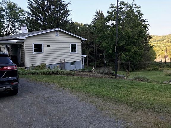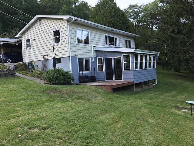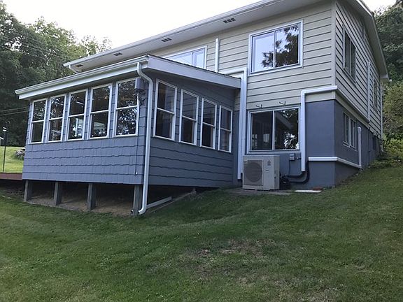 Tucked down over the bank is a delightful 3 bedroom sun filled home. Large living room, efficient galley kitchen with dining area surrounded by windows and ground floor bedroom. Lower level features two additional bedrooms, full bath, large family room with wood-stove, sun-room and laundry room. Newer roof, 4 a/c wall units and detached garage. A short distance to the village. Must be seen to appreciate!