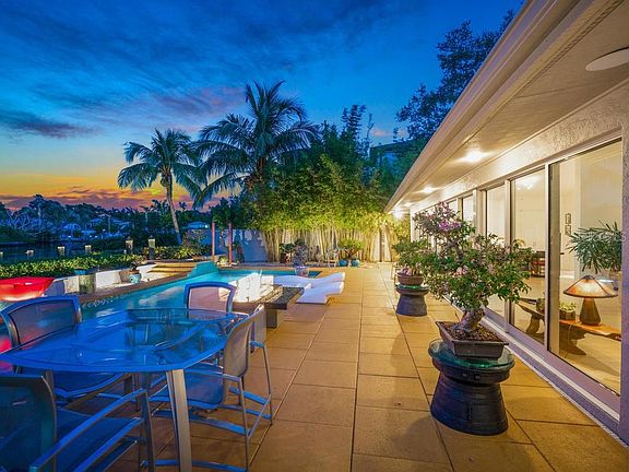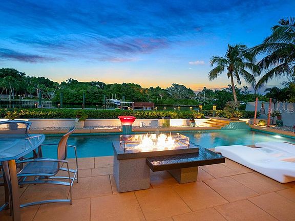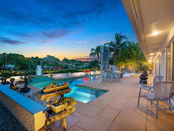 Mid-century modern design, sunshine, and gentle breezes come together in this stunning gated waterfront residence on the north end of Siesta Key. The location is great for the boater or water sports enthusiast with direct access to the bay and Gulf beyond. Designed by well-known Seibert Architects, this home embodies the modernist style in the use of expansive walls of glass, open floorplan, natural materials, clean lines, and functional design. Once inside, one is struck by the sense of space and the wall of glass giving way to the expansive pool area and tranquil water just beyond. Maple hardwood floors, custom cabinetry, exotic granite countertops, and exquisite tile work are just some of the elements running throughout this home. The living room offers vaulted ceilings and room for multiple seating areas. The adjacent dining room is open to the galley kitchen featuring beautiful custom cabinetry, stainless-steel backsplash, high-end appliances including a gas cooktop, walk-in pantry, casual breakfast area, and sliding door access to the front patio. The master suite is a true spa-like retreat and has access to the patio and pool area through a wall of sliding glass doors. There is a guest bedroom, an additional bathroom, and a large laundry room in the main house. Guests will not want to leave their private two-bedroom suite above the garage featuring Saltillo tile floors, vaulted ceilings, built-in cabinetry, and kitchenette. Multiple outdoor seating areas and a 50 foot heated pool, spa and dock with boat lift complete this incredible waterfront retreat.