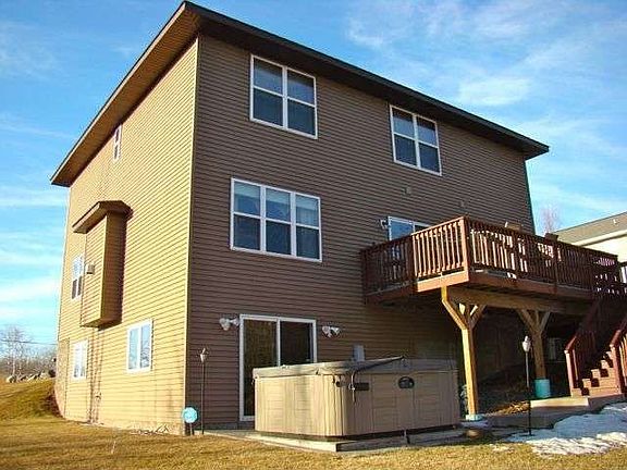 Hermantown Executive Style Living: This move-in-ready two-story home offers a layout that is bright, open and inviting; comfortable for both daily life and entertaining. The main level includes an expansive living room with oak trimmed gas fireplace, open dining with in-lay floor and sliding glass doors to the oversized trex deck, kitchen with granite center island and stainless steel appliances, office with built-in wall cabinet, half bath, foyer and garage entry area. All four bedrooms are located on the upper level, along with a laundry nook, full bath, and master-suite bath with jetted tub and separate shower. The lower level has many finishing possibilities and accesses a concrete patio with a 7-person hot-tub. Finishing is fresh, clean and neutral throughout, and includes white carpet, ceramic tile and oak trim. Also, surround sound on the main level, master bedroom and deck, and alarm system in place, and city utilities; all on over one-half acre in Hermantown.