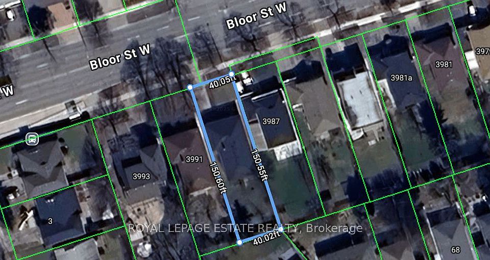 Prime development opportunity on Bloor St W with potential for a larger assembly. 3989 Bloor St W offers a 40 x 150 ft lot being sold as land only. With neighbouring sites also listed on MLS, with a potential for combined frontage of approximately 166.25 ft providing excellent scale and flexibility for redevelopment. A recently accepted settlement by the City now paves the way for implementation of new "as-of-right" development of mid-rise residential buildings on major streets. Be one of the first to seize this opportunity and build a boutique condominium, townhomes or apartment building up to 6 storeys. Featuring a wide right-of-way on Bloor, transit at the doorstep, and proximity to Hwy 427 and Kipling Transit Hub, this site has all the key attributes to deliver a successful mid-rise project under the City of Torontos new housing policies. Planning consultation material available. Please do not walk the property or speak with occupants.