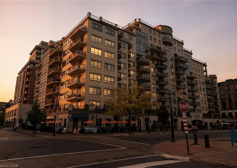 Experience upscale urban living at its finest in this executive-style corner suite located in one of downtown Burlington’s most iconic condominium residences. Perfectly positioned directly across from Lake Ontario, this exceptional property offers an unparalleled walkable lifestyle just steps to the waterfront, Burlington Pier, seasonal festivals, award-winning restaurants, boutique shopping, Spencer Smith Park, and all downtown amenities. Spanning approximately 1,445 sq. ft., this spacious and beautifully appointed unit captures stunning east, south, and west views, filling the home with natural light throughout the day. Thoughtfully designed for both comfort and elegance, the layout features two balconies, ideal for enjoying morning coffee at sunrise or unwinding at sunset with spectacular lake vistas. The open concept kitchen and living area creates a warm and inviting space for entertaining, complemented by an additional den/office area that was opened to enhance flow and maximize living space. A formal dining room framed by windows overlooks the Burlington Pier, offering a breathtaking backdrop for gatherings. This 2-bedroom, 2-full-bath suite showcases classic crown mouldings, hardwood floors, and quality finishes throughout. The primary suite offers a serene retreat with generous closet space and an elegant ensuite. With its prime location, spacious layout, and timeless design, this exceptional residence combines sophisticated condominium living with the best of Burlington’s vibrant waterfront community. A rare opportunity not to be missed. 1 Parking Space and 1 Locker included.