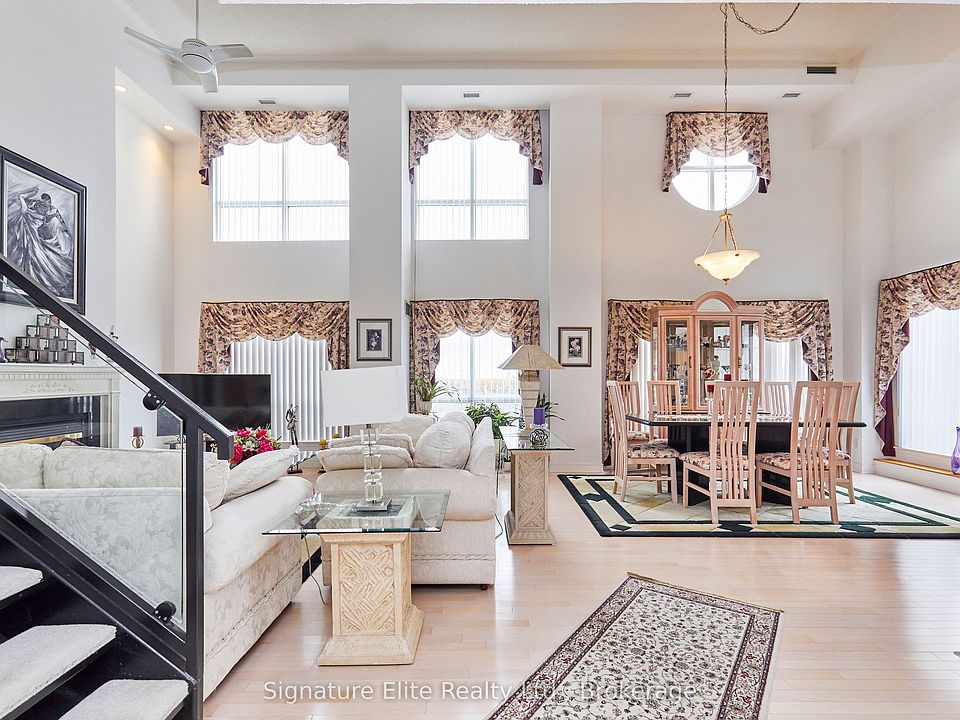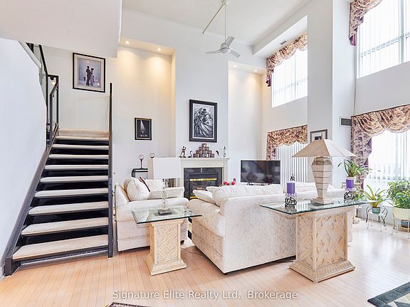 Rare Corner Penthouse in the Heart of Markham's Commerce Valley - Offering Expansive Space, Refined Finishes, and Spectacular South Views. This impressive 2-floor, 3-bedroom unit spans nearly 2,000 sq. ft. and features soaring ceilings in the principal rooms, creating a grand sense of openness and light throughout. The main level showcases a spacious living and dining area with a gas fireplace, large south-facing windows, and hardwood flooring in the principal rooms. The eat-in kitchen includes a breakfast area and a second walkout to the open balcony with sweeping views, offering seamless indoor-outdoor flow for relaxing or entertaining. The primary suite is conveniently located on the main floor, complete with a large 6-piece ensuite, walk-in closet, and custom built-ins for optimal storage, maximizing space. Upstairs, two additional bedrooms provide flexibility for family, guests, or a home office, while the open hallway overlooks the main living area, adding to the sense of scale and architectural interest. A separate main-floor laundry room adds everyday convenience. Includes two parking spaces and two lockers, with all utilities included in the maintenance fees-an outstanding value for this size and location. Residents enjoy access to premium amenities, including a rooftop terrace, gym, and party room. Located in Markham's sought-after Commerce Valley, you're minutes from Highway 7, Leslie Street, top-rated schools, parks, shops, restaurants, and quick access to the 404/407, combining lifestyle and convenience in one of the city's most desirable communities. A rare opportunity to own a true penthouse residence offering space, style, and sophistication-homes like this seldom come to market.