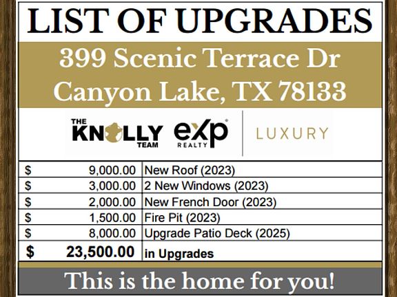 OVER $23,500 IN RECENT UPGRADES! POSSIBLE SELLER FINANCING. Former STR earning $199/night and up to $4K/mo. Welcome to 399 Scenic Terrace Dr, a one-of-a-kind Hill Country retreat with character, history, and incredible potential just minutes from beautiful Canyon Lake. This property began as a manufactured home and was later expanded and partially converted to add valuable living space and custom touches throughout. Set on a peaceful 0.23-acre lot with mature trees and a partial view of the lake from the back deck, it’s the perfect spot for relaxing, entertaining, or enjoying the lake lifestyle. THIS PROPERTY NEEDS SOME RENOVATION/TLC - AND HERE'S WHY: When the current owner purchased the property in 2021, he completely transformed it into a warm, rustic-style cabin filled with antique furnishings and charm. As an Airbnb, it became a guest favorite, earning 4.6-star ratings and generating up to $4,000 per month at $199 per night. Guests loved the quiet setting, the proximity to the water, and the cozy, inviting feel of the space. When the owner relocated to Miami for a new CFO position, long-distance hosting became difficult, so he rented the home to a long-term tenant who unfortunately left it in need of some TLC. The home is now being sold AS-IS and needs mostly cosmetic updates such as flooring, interior paint, and HVAC repair or replacement, but the structure is solid and many major improvements have already been completed, including a new roof, two new windows, a new French door, a fire pit, and a rebuilt patio deck—more than $20,000 in recent upgrades. With its strong bones, partial lake view, and proven short-term rental success, this home offers an incredible opportunity for investors, flippers, or DIY buyers looking for a great deal near Canyon Lake. Update it as a weekend getaway, or bring it back as a profitable Airbnb. Don’t miss this chance to own a unique lake-area property with a great story and a bright future.