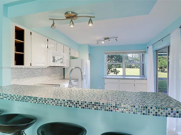 Stylish updatesLuxury plank vinyl flooringScreened patioCream-colored tileBlue tile countertopsCustom shades and blindsUpdated bathroom