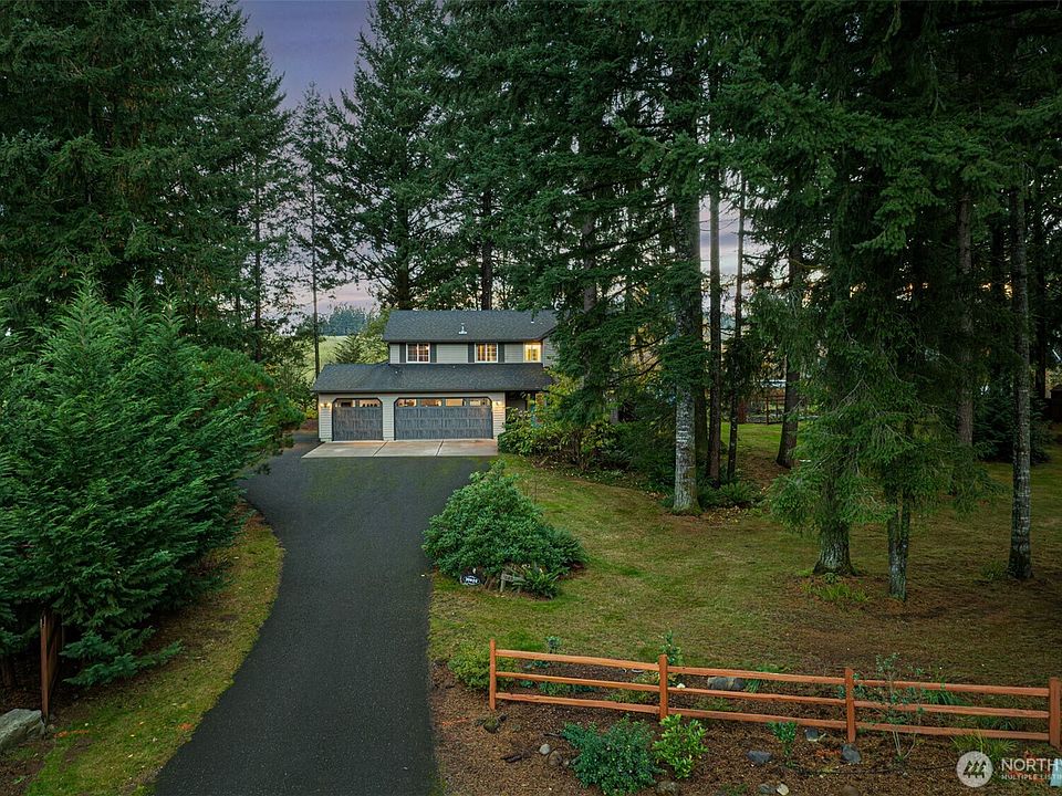 Welcome home! Beautifully maintained private acreage property with an open floor plan, LVP flooring, granite counters, and custom cabinets. The kitchen features stainless Frigidaire double ovens, convection microwave, and a farmhouse sink. Huge main-floor primary suite addition completed in 2023 with vaulted ceilings, dual-sided fireplace, heated tile floors, freestanding tub, and curbless shower. Upstairs offers four more bedrooms, including a second ensuite. Outside, enjoy the oversized covered patio, covered BBQ area, organic deer-proof gardens, 3-car garage, private well, and generator plug. Move-in ready!