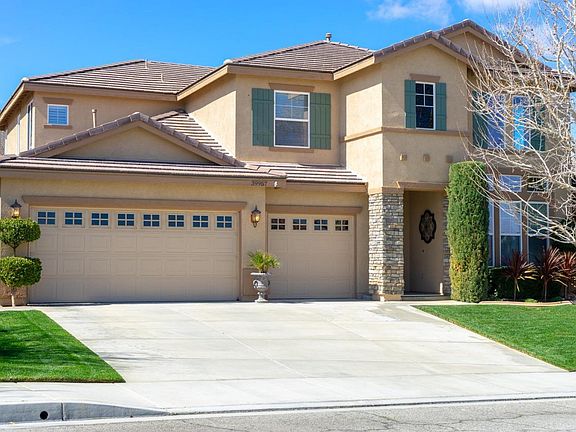 Beautifully Upgraded 4 Bedroom, West Palmdale Home w/3 Car Finished Garage! Downstairs bed & full bathroom! Enormous Formal Living/Dining Room. Custom tile, wood flooring & new plush carpeting throughout! Spacious kitchen with tons of cabinetry, walk-in pantry, granite counter-tops & center island w/cozy breakfast bar. ** Plantation shutters & gorgeous hardwood curtain rods & window treatments! Secluded upstairs loft, perfect for a movie/game night! All bedrooms have high-end upgraded ceiling fans! The Master Suite showcases duel sinks, separate Jacuzzi tub/shower & huge walk in closet. Downstairs laundry room w/sink. Fully landscaped park-like backyard w/concrete patio, permitted patio cover, inviting pergola, block planter walls & 2 beautiful fountains! Immaculate inside & out!!