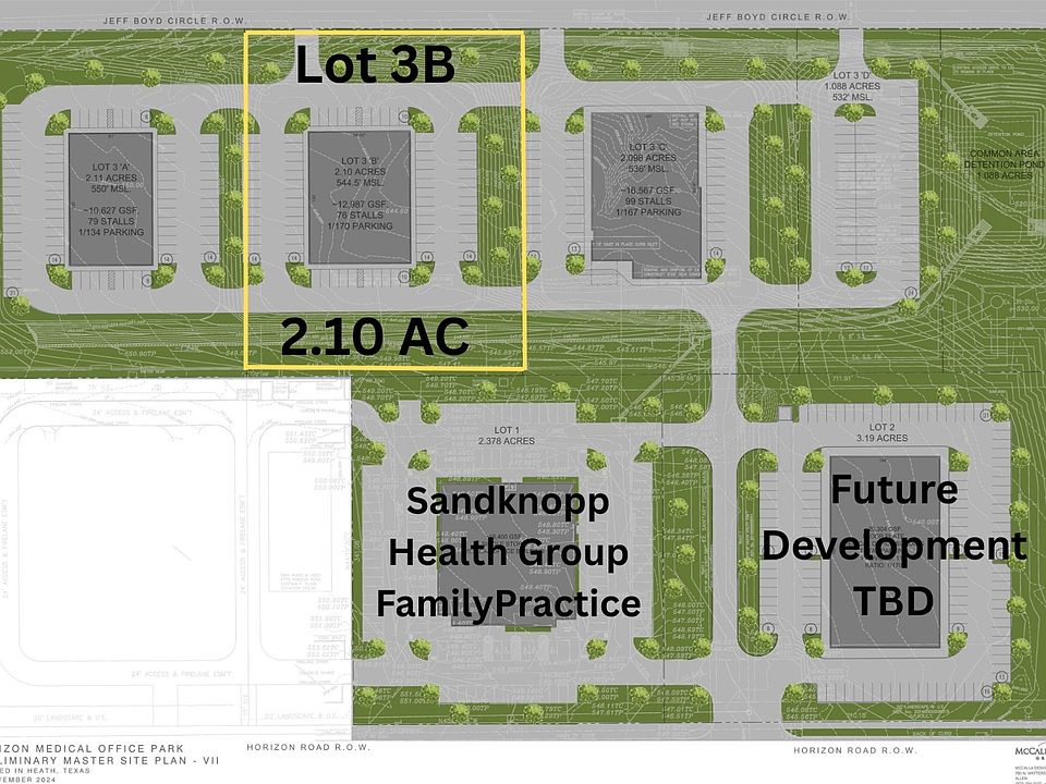 Prime location! (3) Three building sites (pad ready) located in the Heath's Horizon Business & Medical area already zoned commercial with all utilities on site. Located at Horizon & FM 549 (Buffalo Way) one of the main thoroughfares between Heath & Rockwall & just 2 miles from the Texas Health Hospital which offers a close and convenient proxomity to most other medical services & specialties. Nearby is Baylor Medical Plaza & these three sites are directly ajacent to the nearly complete 18,000SF Dr. Sandknop's Family Medical Practice, A Cardiology Group & a medical labratory as well. Zoning allows for office and retail as well. The availability of land that is aleady zoned and ready to go in the Rockwall & Heath area is virtually non existant. Survey's available.