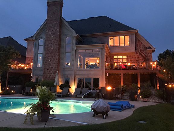 Paradise! Perched high for spectacular panoramic views of the pond and nature, this custom home features every luxury. Literally, the best lot in Fox Mill, with .38 acres nestled on a quiet cul-de-sac! Floor-to-ceiling picture windows bring nature indoors as you overlook the huge pond just steps past your pool and hot tub. Derrico Builders is known for its amazing craftsmanship with white stacked millwork, crown moulding, beam and tray ceilings, and wainscoting. A stately brick exterior with cedar touches makes for a solid home. Elegant volute newel posts on the stairway in the large two-story foyer plus a separate back stairway to the kitchen for privacy. Bright open kitchen with granite counters, cherry cabinets, and a two-level island with seating for six overlooks the lofty family room and the eat-in with elevated tray ceiling (check out that full wall picture window!) Easy access to one of the trex decks (& stairs heading down to the side/rear yard) off the eat-in. The family room features 32-foot beamed ceilings with a full brick floor-to-ceiling fireplace flanked by tall windows and handy access to the other trex deck. The family room deck has an attached gazebo that stays with screen curtains and solid privacy curtains to keep you cool during the summer months while viewing the private nature behind. It also has glass balusters to give an unimpeded view. The cheerful sunroom would be a great playroom/extra office and is directly off the family room with huge windows. Sunroom could be 1st floor master bedroom if shower is added to powder room. French doors lead to a quiet den with classic wainscoting, coffered ceilings, recessed lighting, and a full wall of built-ins-bring your books! The elegant dining room is expansive with tray ceilings, stacked crown moulding, wainscoting, and chair rail for large dinners or holidays. Could easily be converted to a living room if wanted. The main suite is to die for with a rehabbed luxury bath and a closet the size of a bedroom...custom closet organizers and a huge island with drawers and shelves! The main bath has been rehabbed with a beautiful whirlpool stand-alone tub, touch (on/off) faucets, extra cabinetry, granite counters, new tile, and a new glass shower door/enclosure. Bedrooms 2 & 3 feature tray ceilings with a cute jack & jill bathroom with 3 skylights above! Bedroom 4 has cathedral ceilings and its own full bathroom with a tub/shower combo! After lounging by the pool and hot tub come relax in the 9 ft walk-out basement--play pool, throw darts, serve up fun drinks at the wet bar, and snuggle by the cozy fire. Great space for a home theatre too. Basketball hoop on the driveway for even more entertainment. Extra guest space in the basement with a 5th bedroom/office and full bathroom plus a regular shower that can convert to a sealed steam shower, great for colds/asthma. 2023-partial interior painted. 2020-full exterior painted. 2020 new carpet. 2021-23-HVAC featuring an electrostatic filter. 2022-roof. 2020-salt water pool updates-pool liner, electrical, pool lights, gas heater, pump, pool cover, and new hot tub installed. 2023-new windows Storage everywhere, some walk-in attic space is right off the huge master bed and walk-in closet, large 1st-floor front and back closets, walk-in pantry, and two oversized storage closets in basement. Out in the yard you'll find a 5-in-1 apple tree and pear tree too! Runners, walkers, bikers-miles of paths thruout the neighborhood and across rt 64-prairie path. Tons of natural open space to spread out and play, neighborhood assoc regularly holds great kid, work, family, sport, and holiday events. The beautiful clubhouse can be used for parties and just head to the Fox Mill pool if you'd like to socialize a bit with your friendly neighbors!