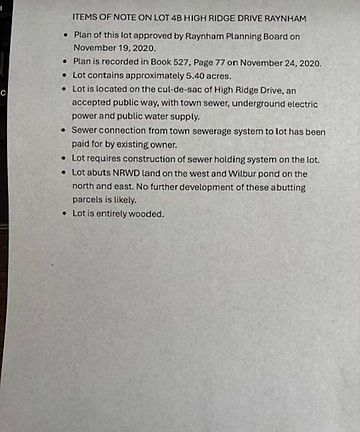 Beautiful wooded lot at the end of High Ridge Dr. Cul-de-sac with public water and sewer available. A sub division of established high end homes. One of a very few lots in a Raynham sub division available to bring your own builder. The Plan is Recordrd at N. Bristol Registry plan Book 527 Page 77. Note.. This subdivision does NOT have a monthly or yearly Association fee. Call for more details.