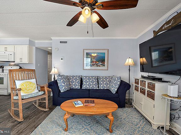 Here’s the beach retreat you’ve been waiting for! This beautifully maintained, first-floor east-end unit at Salty Sands showcases true pride of ownership. Ideally located in Mid-Town Ocean City, you’ll be just steps from the area’s best restaurants, entertainment, and short walk to the beach. Flooded with natural light, thanks to upgraded hurricane-resistant windows, this unit offers ocean views and a bright, airy atmosphere. The spacious deck with southern exposure is perfect for relaxing or entertaining, accessed via a hurricane-rated sliding glass door. Renovated in 2019, the interior boasts a modern open-concept kitchen and dining area, ideal for family gatherings. The kitchen features Corian countertops, stainless steel appliances, and a large pantry for ample storage. Water-resistant vinyl plank flooring throughout the kitchen and living area provides durability and easy maintenance, while both bedrooms offer cozy carpet for comfort. The bathrooms have been completely updated with new tile showers, vanities, and fresh paint. Every detail has been thoughtfully updated for style and function. Salty Sands is a well-managed building with recent upgrades including a new roof, new railings, parking garage improvements, and concrete work—a true testament to the care and pride of its owners and management team. Enjoy two assigned parking spaces (65 and #136) and make this exceptional beachside condo your coastal getaway!