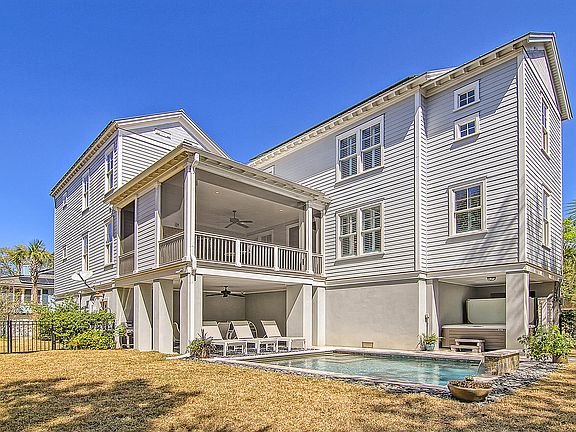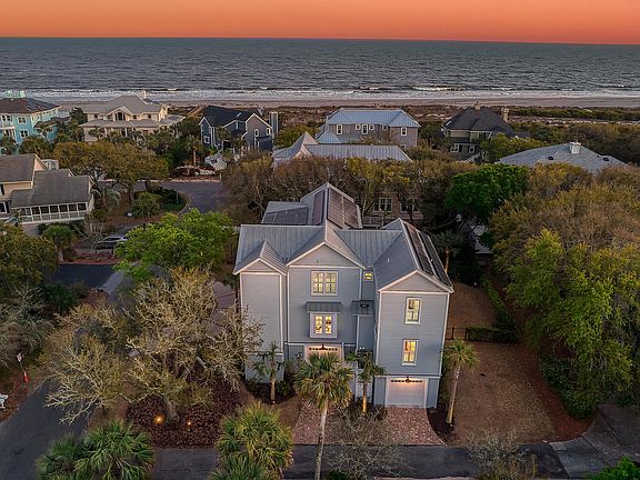 Built in 2016 by Max Crosby Construction, this custom home is just steps from the white sand beaches of Isle of Palms & Wild Dunes with all of its amenities! The elevated home boasts a dual owner's retreat floorplan, has FOUR separate outdoor living spaces, an elevator that takes you to all floors, an outdoor shower, hot tub and in-ground pool to retreat to after a day at the beach. Set among towering oak and palm trees there is a circular driveway in the front of the home with access to the two car garage located on the side of the home. Entering the home from the front porch you'll discover a sun drenched open floor plan where the living room, dining room and kitchen all flow together. Ten foot high ceilings and gleaming oak hardwood flooring also make their appearance in thiselegant home. There is a wall of built-ins in the living room and the gourmet kitchen features breakfast bar seating at the center island, tall modern cabinets, SS appliances, subway tile backsplash and access to the walk-in pantry and scullery with beverage fridge and integrated ice maker. French doors lead to the office that has a built-in desk, then off of the living room is the screened-in porch with a brick surround fireplace, which is just the perfect place for everyday outdoor dining. The owner's retreat on this floor is a mirror image of the one above with two walk-in closets and an en-suite full bath with dual vanities, a soaking tub and walk-in shower. On the top level is the second owner's retreat, two additional bedrooms, two full baths, a living room area with access to the double, bunk bed bedroom with a cathedral ceiling, the gorgeous laundry room that has brick flooring. There are a ton of features take note of including, plantation shutters throughout, landscape lighting, the irrigation system, whole house generator, central vacuum, and 55 solar panels that kept total 2022 electric bill to only $537 for the entire year! The large, fully enclosed garage with cinder block walls to keep the critters out, features built in storage and a dehumidifier. The fenced-in backyard is shaded and home to the heated and chilled in-ground pool with its peacefully flowing water feature and the covered patio area. Do not miss out on this amazing home and location!