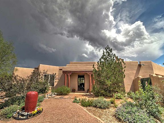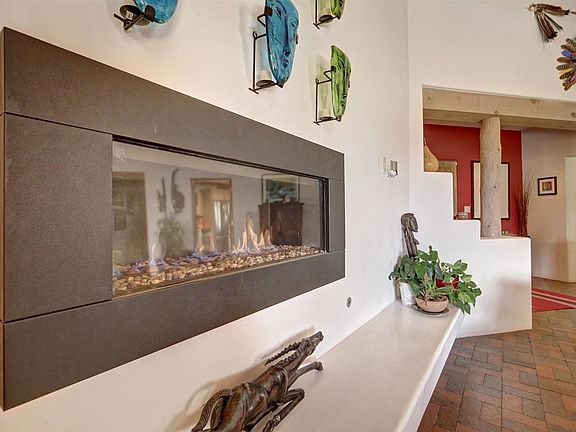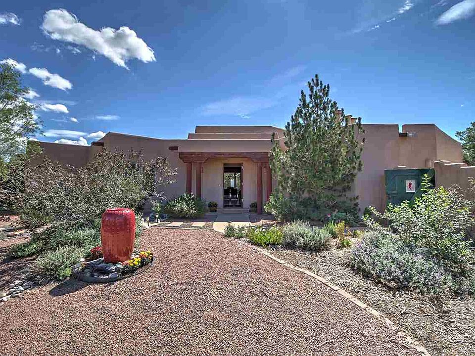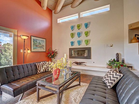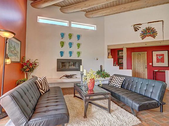 Elegant and stylish custom built home with dramatic high ceilings in the living room, and exceptional outdoor spaces. Walled in courtyard off the living room and master bedroom and expansive fenced in landscaped yard on the north side with numerous areas for enjoying sunsets and sunrises. Brick floors throughout with the exception of one guest room. Great eat in kitchen with an island and access to the gorgeous yard. Wonderful home for entertaining or just enjoying the peace and quiet. Solar panels mean no electric bills for you and every couple of months there is a rebate from the electric company.