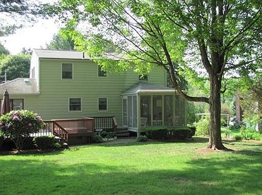 NEW PRICE! Cape/Gambrel style home with much to offer: BRAND NEW Roof shingles (6/2015), FRESH exterior painting, Hardwood flooring in DR,LR, and Den on 1st floor, Fireplaced Living Room, Beamed Ceilings in LR & DR, Updated kitchen with island & solid surface countertops, SS appliances, large kitchen for everyday dining, and perfect for party overflow. Roughed for A/C - just need compressor. Walk onto the deck, with one step and extend your dining experience, or simply relax and enjoy the beautifully landscaped backyard. OR simply step into your hot tub for total relaxation. Very private area. Enclosed,screened porch to enjoy into late season, and is attached to rear deck. Potting & storage shed neatly handle all your tools, & lawn equipment. Brand NEW roof on shed. Garden rain barrel for energy saving enthusiasts. Great Commuter Location. Say YES to this House!