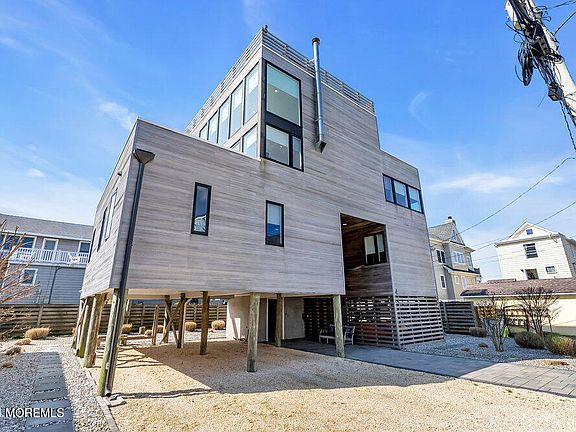 Welcome to 4 Atlantic Way, a stunning modern home that epitomizes beachside luxury with award-winning design and unmatched comfort. Built in 2016, this property quickly garnered attention and was featured as both the Editor's Pick and House of the Day by Dwell magazine in 2017, and highlighted in New Jersey Monthly's 2018 showcase of exceptional beach houses. Experience the seamless blend of luxury and comfort from the moment you enter. This home features a reverse layout, meticulously designed to capitalize on the extraordinary views of the ocean and river. The natural cedar exterior and vast windows merge the scenic outdoor elements with the elegant interior, creating a serene living environment. The first level boasts 1200 square feet of sophisticated and versatile living space including three exquisitely designed bedrooms and a cozy guest nook, perfect for relaxation and privacy. Every detail and finish reflects quality craftsmanship, ensuring both style and functionality. Venture upstairs to discover the expansive 1400 square foot open floor plan on the second floor. The great room, with its soaring 20-foot ceilings and floor-to-ceiling ocean-facing windows, bathes the space in natural light and provides panoramic views of sunrises over the ocean and sunsets over the river. The layout is an entertainer's dream, featuring a spacious living area, a dining section with a 9-foot raw wood table, and a gourmet kitchen equipped with an 11-foot center island, quartz countertops, and premium GE Café appliances. Outdoor living is elevated to new heights with three distinct decks, each offering unique and spectacular vistas. Enjoy your morning coffee on the ocean deck, unwind in the evenings on the river deck with stunning sunset views, or host gatherings on the expansive roof deck that boasts 360-degree ocean and river views, including the Manhattan skyline. Additional amenities include a strategically placed office area on the mezzanine level, perfect for those who work from home, and multiple outdoor spaces that enhance the enjoyment of this coastal haven. Plenty off-street parking, up to six vehicles. Situated conveniently between Sandy Hook and Sea Bright beaches, this property is steps away from a secluded sandy beach, providing a private escape. With the Sea Streak Ferry nearby, commuting to NYC is effortless, making it an ideal residence for those seeking tranquility with city accessibility. 4 Atlantic Way offers a rare opportunity to own a piece of paradise, combining floorplan versatility, quality craftsmanship, and the pinnacle of coastal living. Discover your dream home where every day feels like a vacation.