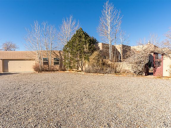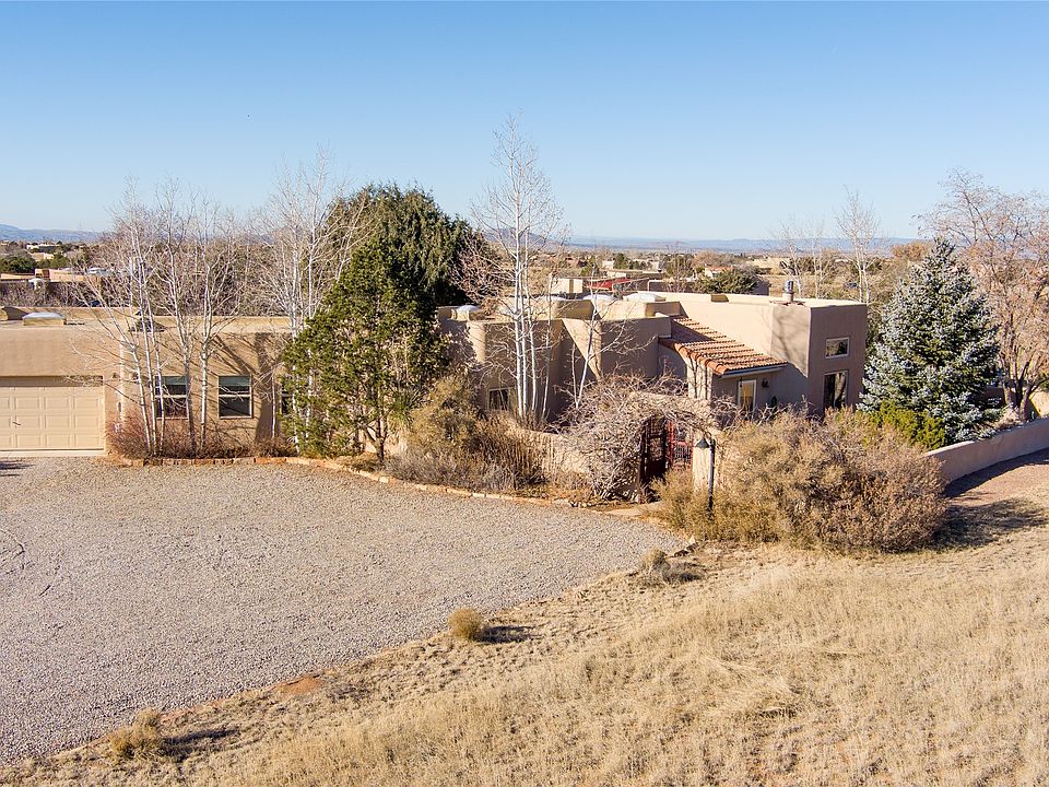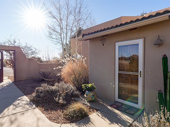 The sole owner of this property has, over the course of twenty four years, created a retreat and haven through lush, mature landscaping, exterior sculptures, an herb garden and prolific pear trees! All this will be passed onto the lucky buyer of this stylish, comfortable, well maintained home. In the summer months, a walled in courtyard filled with blooming flowers and shrubs greets visitors and a covered, walled portal off the dining area allows for cool indoor/outdoor living for which Santa Fe is so famous. In colder months, keep yourself entertained in a generous media room with large viewing screen and state of the art video equipment. Or cozy up with a book in the living room, complete with a natural gas kiva fireplace. Natural light is abundant with multiple skylights throughout the house and large windows taking advantage of the Sangre and Jemez Mountain views. There is good separation of space between the generous master bedroom suite, which includes a jetted tub in the bath and guest bedroom and a bonus room which can be used for an office space or hobby area. A new roof was installed in 2020. Drip irrigation keeps the landscaping lush and an invisible fence will be left to keep your dog from wandering. Best of all, the majority of the furniture, accessories and sculptures will be left to enjoy at no cost to the buyer! This property has many more great features that can only be appreciated through a showing. You'll see the value of this home immediately!