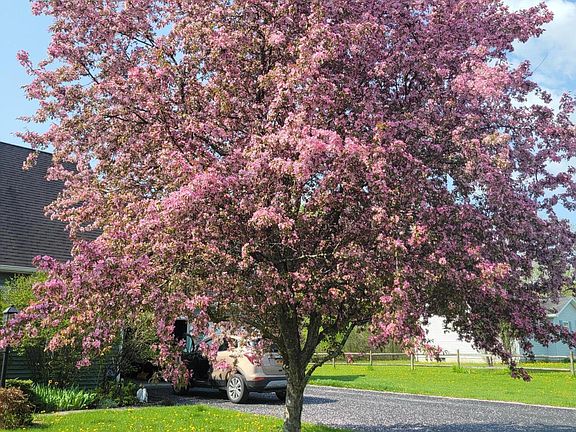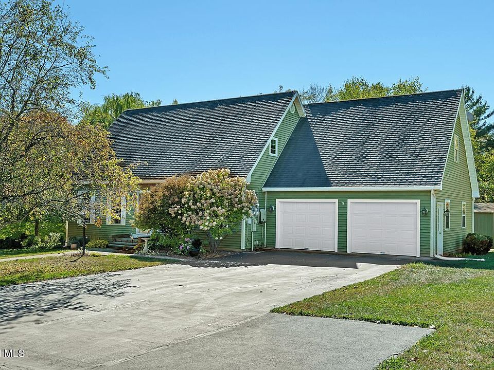 Immaculate home featuring stunning views and a generously sized, beautifully landscaped lot. The bright, thoughtfully designed eat-in kitchen boasts a granite-topped island and a Bosch dishwasher, with sliding doors leading to a deck sheltered by a retractable awning. There are two spacious bedrooms located upstairs, while the master suite is conveniently situated on the first floor and includes a luxurious jacuzzi bath. Ceiling fans are installed throughout the home. The property also includes an oversized two-car garage with an unfinished loft space. Additionally, there is an office/family room located in the basement. This home is equipped with an emergency propane generator and features solar panels, a new A/C 2025, a deck that is just two years old, and a shed that is six years old.