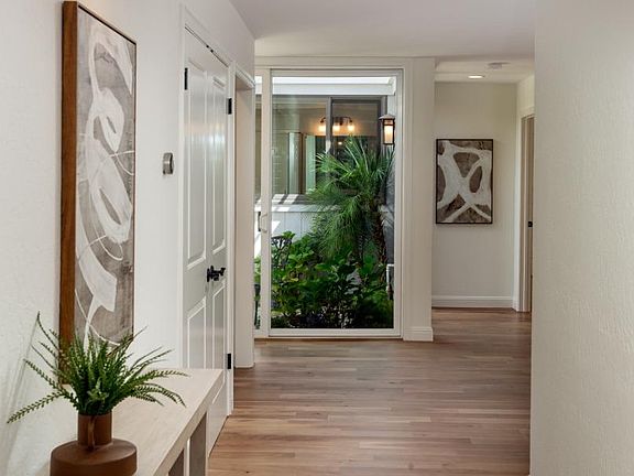 Refined single-level living awaits in the prestigious gated community of Creekside Oaks. Privately set across from a graceful old oak tree, this thoughtfully designed home offers timeless style and everyday convenience with close access to walking paths, ponds, and fountains. The open-concept chefs kitchen features granite countertops, full-height backsplash, stainless steel appliances, double ovens, gas cooktop, peninsula with bar seating, and a bay window dining nook. The expansive living room includes skylight, recessed lighting, a marble surround fireplace, and mirrored wet bar. An airy dining room with chandelier opens to the stone patio for indoor/outdoor entertaining. The serene primary suite provides patio access, custom closets, built-in dresser, and spa-like bath with tub, shower, and dual vanity. A comfortable guest suite and flexible office/den add versatility. Additional highlights: engineered hardwood floors, plantation shutters, air conditioning, atrium with irrigation, laundry room, and two-car garage with epoxy floors, workbench, and storage. Set on 19 acres of park-like grounds with two pools, spa, bocce court, historic barn, and guest parking. HOA dues $1,452/month. Close to The Village of Los Altos and award-winning Los Altos schools (buyer to verify).